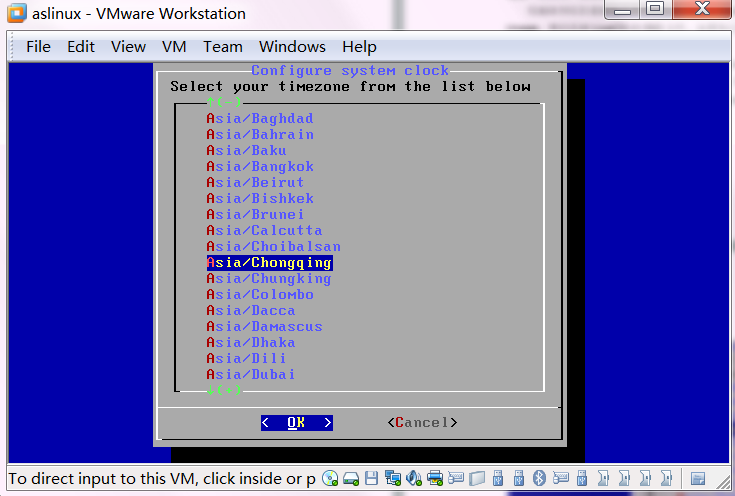 好了,现在进入虚拟机,点击回车,屏幕滚动一些字符后出现如下的选择时区画面,使用键盘的上下箭头选中 Asia/Chongqing (亚洲/重庆)后回车。