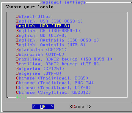 之后是选择时钟,使用默认的 Localtime 本地时钟即可,回车之后是选择语言,使用上下箭头选中 English, USA (UTF-8) 然后回车。
