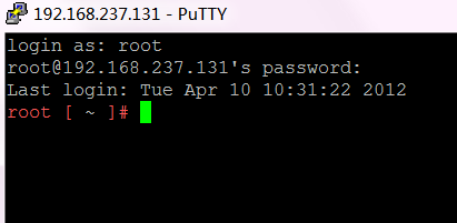 之后将会看到窗口中打印出了 login as: 的提示,输入 root 后回车,然后输入之前在虚拟机中设置的 root 密码,命令提示符就出来了: